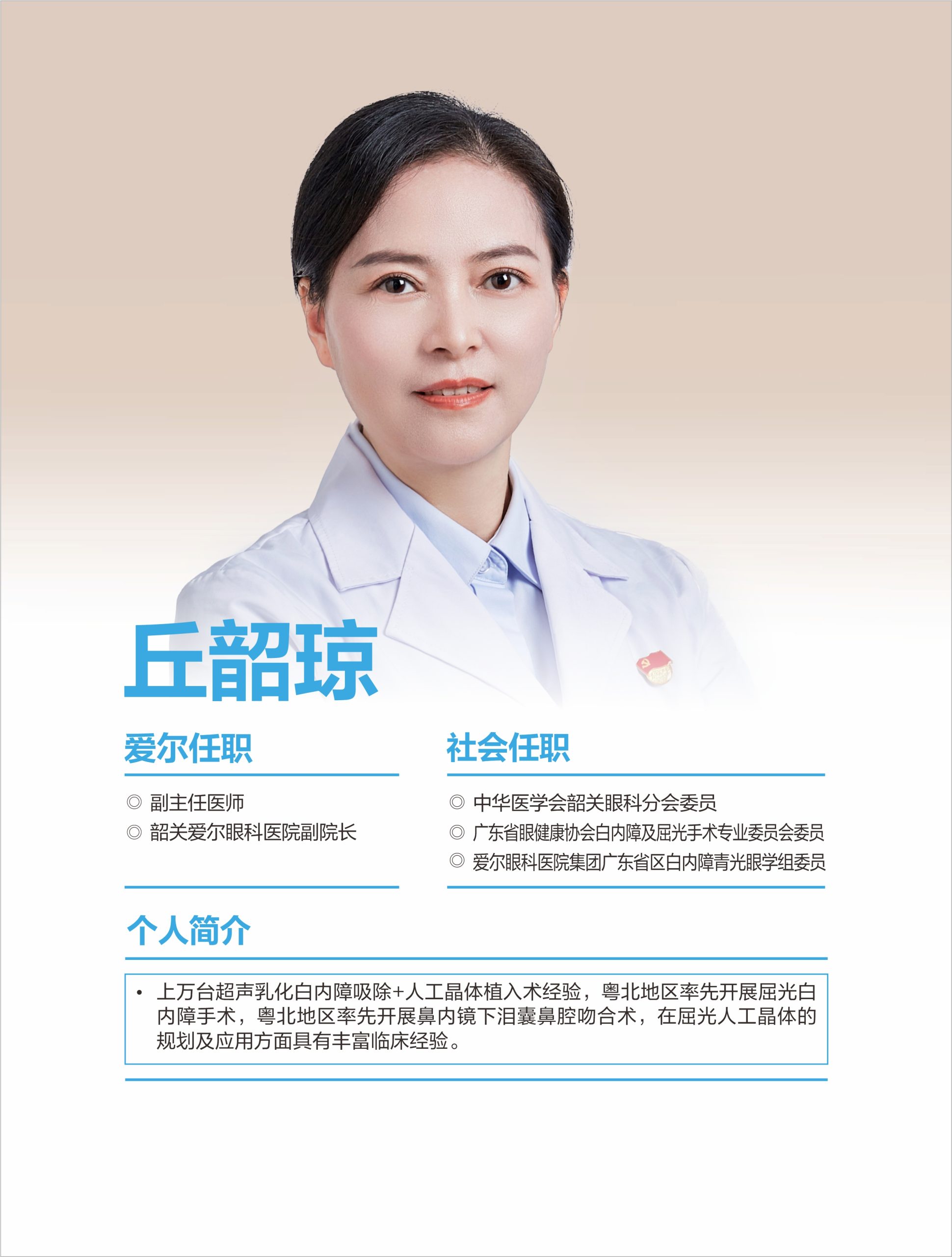 韶關(guān)愛爾眼科醫(yī)院有限公司白內(nèi)障團(tuán)隊(duì)擁王愛琴院長(zhǎng)(愛爾眼科粵北區(qū))、丘韶瓊院長(zhǎng)、郭俊豪主任等多位專科醫(yī)生,具備同步國(guó)際的白內(nèi)障手術(shù)能力,能熟練開展各項(xiàng)常規(guī)及疑難白內(nèi)障手術(shù)。 可開展微切口煥晶白內(nèi)障手術(shù),植入多焦晶體或多焦+散光矯正晶體,在治療白內(nèi)障同時(shí)同步解決遠(yuǎn)視/近視、老花眼、角膜散光等屈光問題,醫(yī)生手術(shù)經(jīng)驗(yàn)豐富,為眾多患者帶來更舒適的視覺。